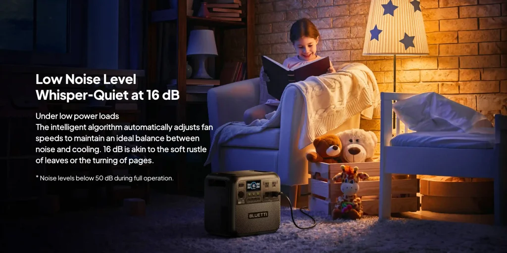 سیستم UPS با زمان سوئیچ کمتر از ۱۵ میلیثانیه، در قطعی برق، دستگاههای حیاتی مانند روتر یا CPAP را بدون وقفه روشن نگه میدارد و از از دست رفتن دادهها جلوگیری میکند. خنککننده هوشمند با صدای ۱۶ دسیبل، پاور استیشن هوشمند 2600 وات BLUETTI مدل Elite 200 V2 را برای استفاده شبانه یا خانگی بدون مزاحمت مناسب میسازد و فنهای خودکار، دما را به طور خودکار مدیریت میکنند تا عملکرد بهینه حفظ شود.