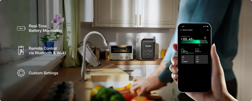 اپلیکیشن EcoFlow از طریق بلوتوث یا Wi-Fi، امکان نظارت بلادرنگ بر وضعیت باتری، کنترل خروجیها، تنظیم سرعت شارژ و هشدارهای اضطراری را فراهم میکند. کاربران میتوانند مصرف انرژی را بهینه کنند، دستگاه را از راه دور خاموش/روشن کنند و حتی در حالتهای هوشمند، انتقال seamless از برق شهری به باتری را تجربه کنند. این ویژگی برای کاهش هزینه قبض برق و افزایش طول عمر باتری بسیار کاربردی است و بهروزرسانیهای مداوم، عملکرد را بهبود میبخشد.