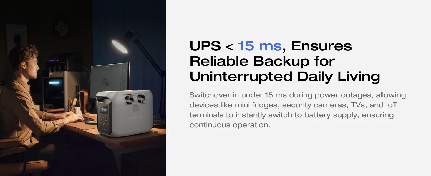 با سرعت سوئیچ کمتر از ۱۵ میلیثانیه، سیستم UPS در پاور استیشن هوشمند اکوفلو مدل EcoFlow DELTA 3 1500 تضمین میکند که در صورت قطعی برق، دستگاههای حیاتی مانند یخچال، آکواریوم ماهی، CPAP یا روتر Wi-Fi بدون وقفه روشن بمانند. این ویژگی در مواقع اضطراری مانند طوفان یا قطعیهای ناگهانی، امنیت بیشتری فراهم میآورد و پاور استیشن هوشمند اکوفلو مدل EcoFlow DELTA 3 1500 را به یک پشتیبان واقعی برای خانه تبدیل میکند. پشتیبانی از لوازم حساس، از از دست رفتن دادهها یا اختلال در عملکرد جلوگیری میکند.