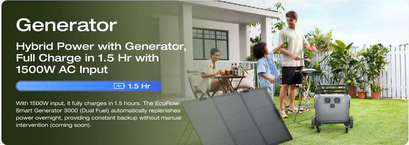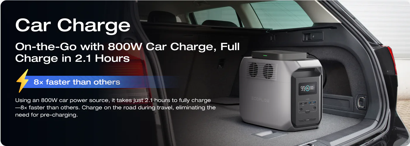 - شارژ فوقالعاده سریع: پنج روش شارژ شامل AC (۱۵۰۰ وات، ۸۰ درصد در ۶۰ دقیقه)، خورشیدی (۵۰۰ وات، کامل در ۳.۵ ساعت)، خودرو (۸۰۰ وات، کامل در ۲.۱ ساعت)، ژنراتور هوشمند و هیبریدی (AC + خورشیدی).