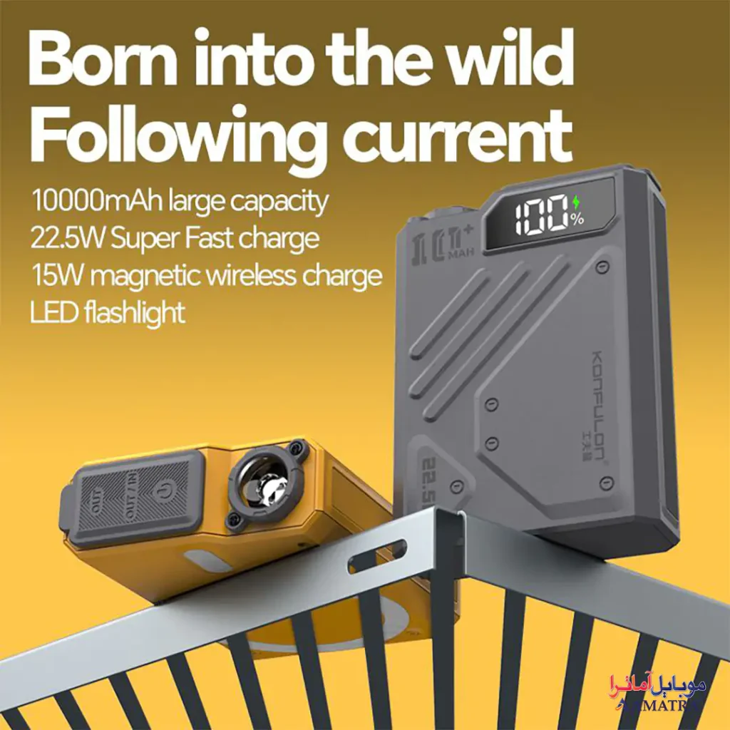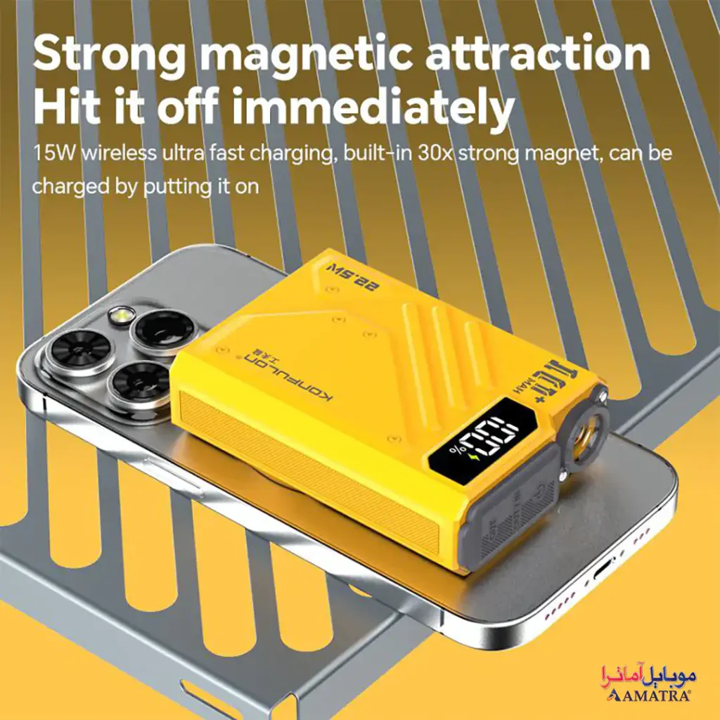 پاوربانک مگ سیف وایرلس ۱۰۰۰۰ چراغ دار مدل Joko J38 با ظرفیت اسمی ۱۰۰۰۰ میلیآمپرساعت (۳۷ واتساعت، واقعی ۶۲۰۰ میلیآمپرساعت / ۳۱ واتساعت)، یک دستگاه شارژ چندکاره با شارژ بیسیم (تا ۱۵ وات)، کابل داخلی Type-C PD (۲۰ وات)، و خروجی USB فست شارژ ۲۲.۵ وات است. این پاوربانک با سیستم محافظتی چندلایه، شارژ همزمان چند دستگاه، و طراحی شیک و قابل حمل (وزن حدود ۲۰۰ گرم، ابعاد ۱۵۰×۷۰×۲۰ میلیمتر تخمینی)، گزینهای ایدهآل برای کاربرانی است که به شارژ سریع و بیسیم برای گوشیها، تبلتها، و گجتهای هوشمند نیاز دارند. با پشتیبانی از PD ۲۰ وات و QC/SCP ۲۲.۵ وات، پاوربانک مگ سیف وایرلس ۱۰۰۰۰ چراغ دار مدل Joko J38 سرعت و ایمنی را در هر سفر یا استفاده روزمره تضمین میکند.