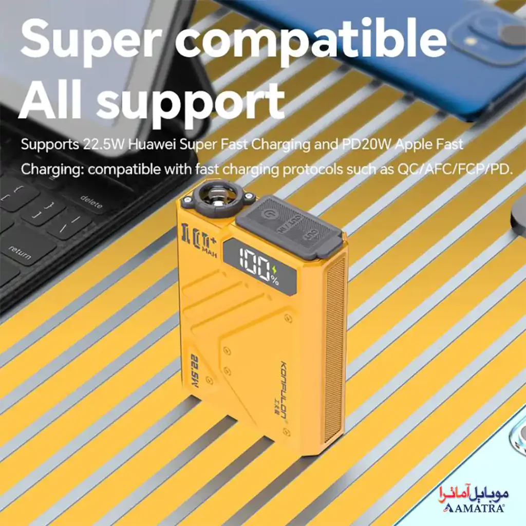 پاوربانک چراغ دار ضد آب ۱۰۰۰۰ فست شارژ مدل Konfulon A59Q با انواع گوشیهای اندروید، آیفون، تبلتها، هدفونها و دستگاههای USB سازگار است و شارژ ایمن بدون آسیب به باتری ارائه میدهد. زمان شارژ کامل ۲ تا ۳ ساعت با آداپتور PD، آن را به گزینهای سریع تبدیل میکند و کاربران را همیشه آماده نگه میدارد.